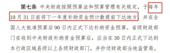 2019年国家卫健委下发了《重大传染病防控补助资金管理办法》中第七条,中央财政重大传染病防控补助资金管理,按照中央财政预算法和预算管理有关规定,于每年10月31日前将下一年度补助资金预计数提前下达地方,并在全国人大批准预算后90日内正式下达补助资金预算。省级财政部门在收到中央财政补助资金预算后,应当在30日内正式下达到本行政区域县级以上各级财政部门,并抄送财政部当地监管局。